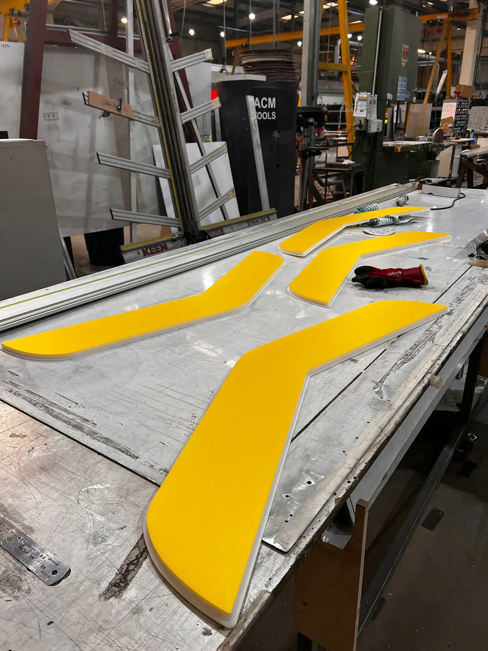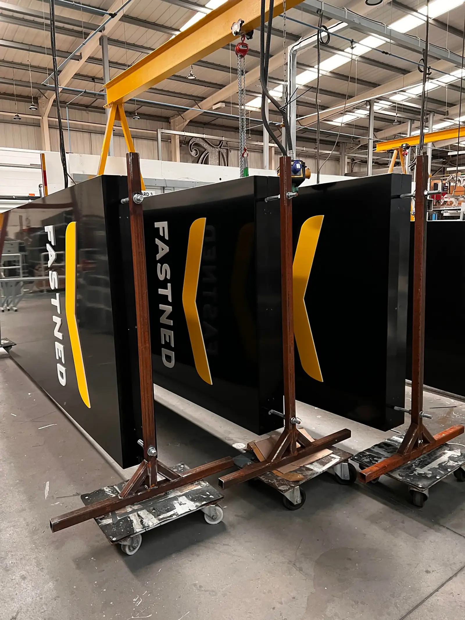 Industrial warehouse interior with large black and yellow Fastned equipment and overhead cranes.