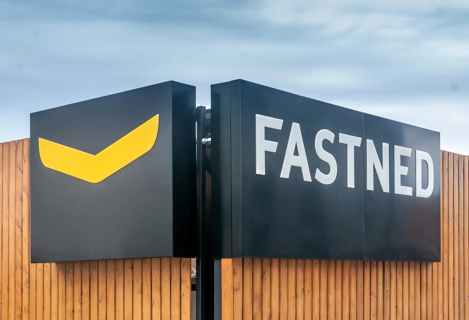 A black sign with "FASTNED" and a yellow logo stands against a wooden fence and cloudy sky.