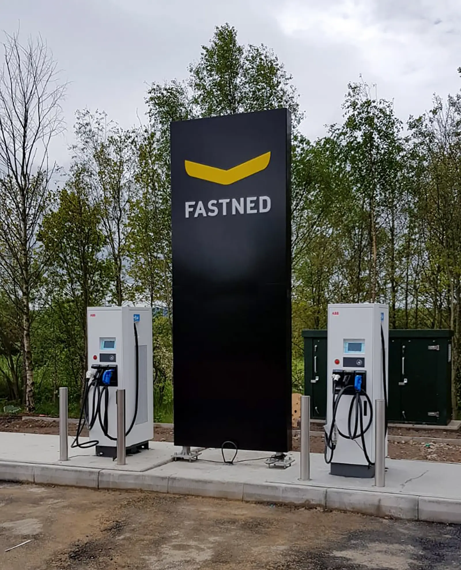 Black sign with a yellow stylized "A" and "Fastned" text, surrounded by green trees.