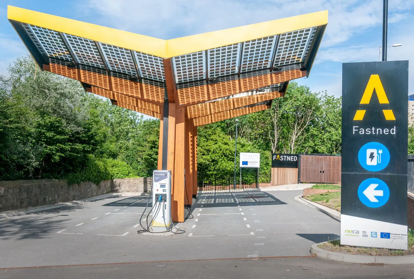 A solar-powered Fastned charging station with a distinctive V-shaped roof amidst greenery.